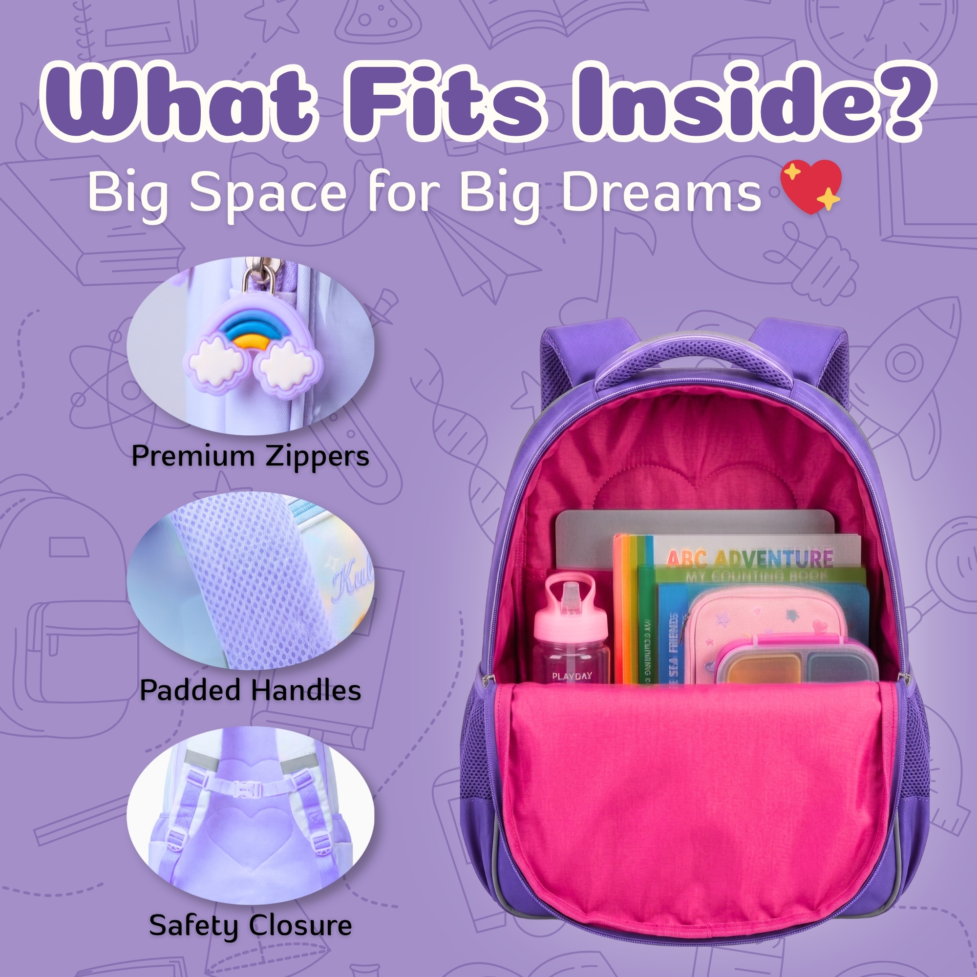 - Spacious main compartment for textbooks notebooks lunch box and daily school items