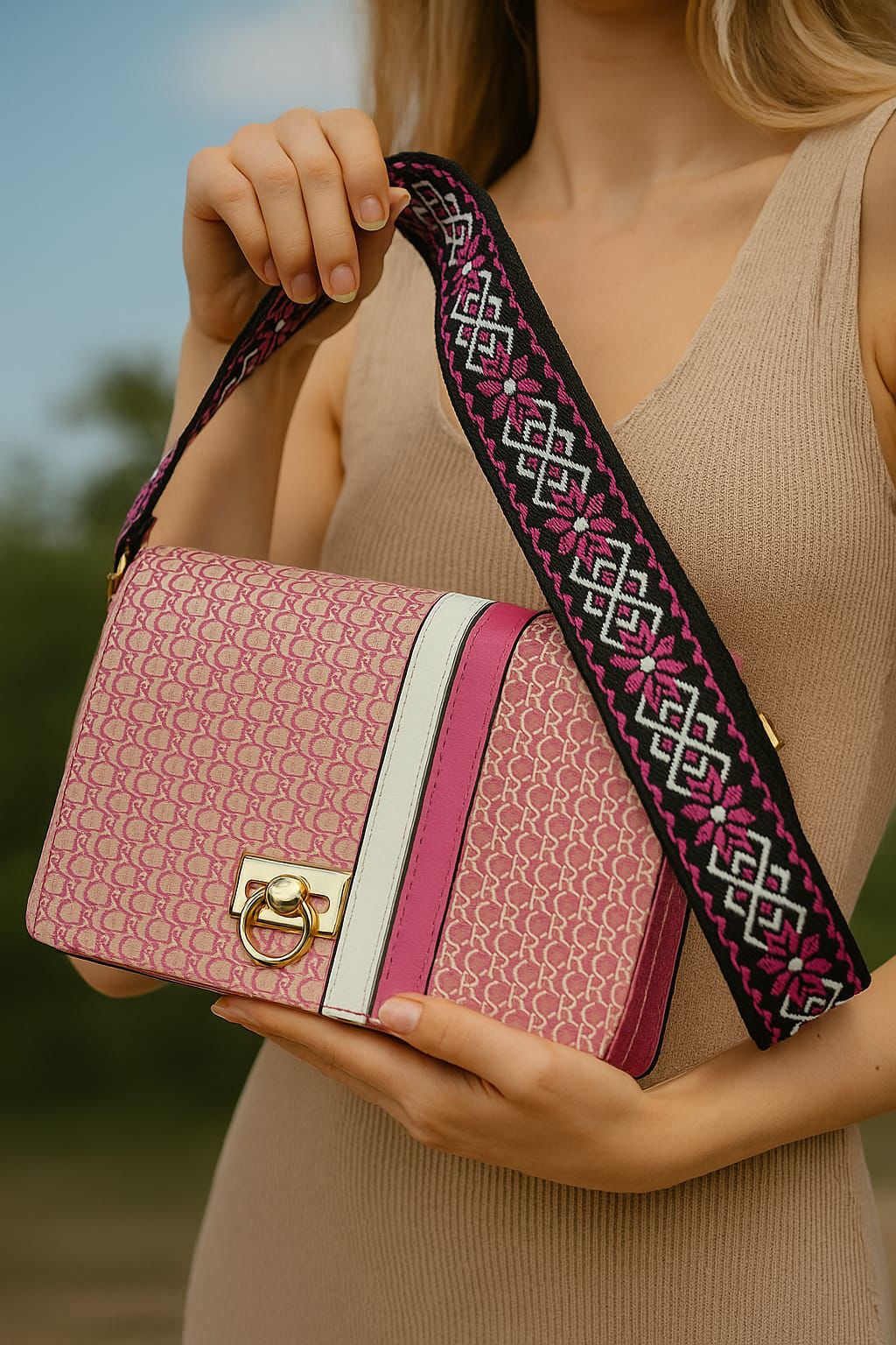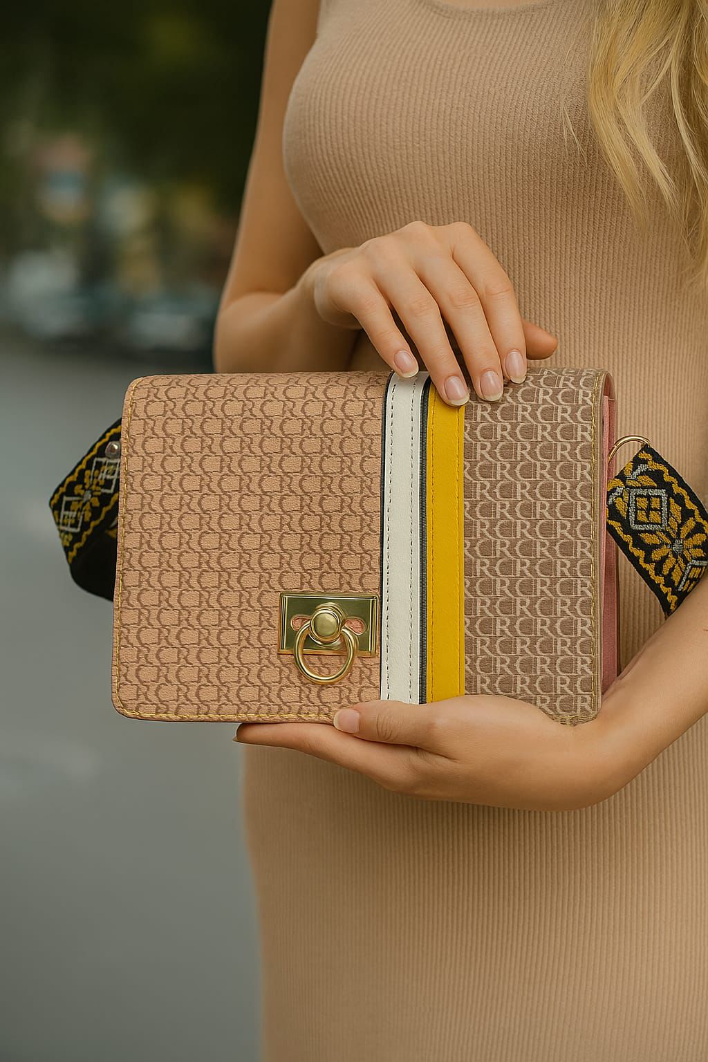 Premium Design: Crafted with a stylish textured finish, detailed with bold color accents and a signature gold-tone clasp for a high-end look.